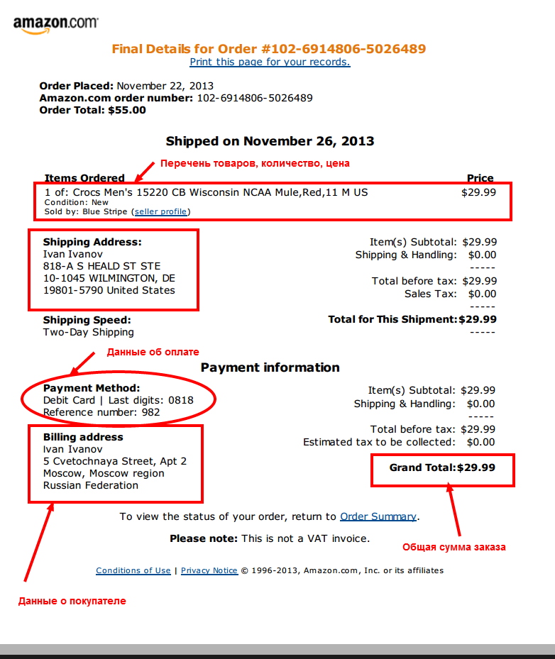 В разных интернет-магазинах инвойс может именоваться по-разному: Order Confirmation, Order Summary, Order Receipt и т.д. Данный документ обязательно должен содержать следующую информацию: