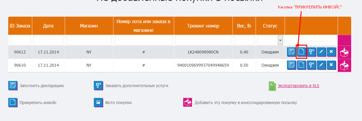 После того как Вы создали файл с инвойсом, его необходимо загрузить в Личный кабинет напротив соответствующего заказа: