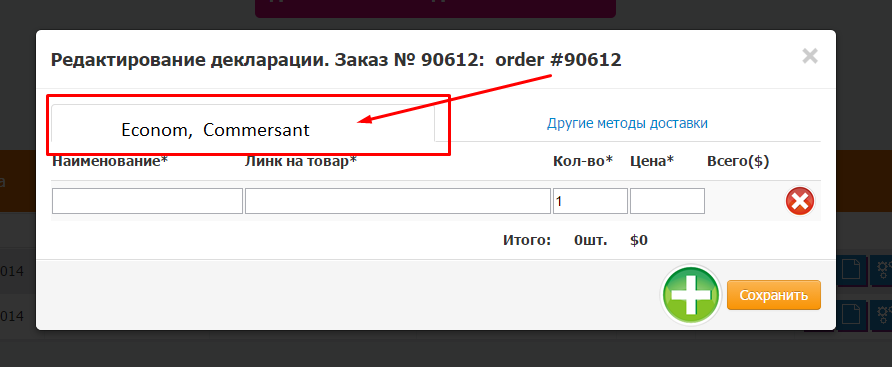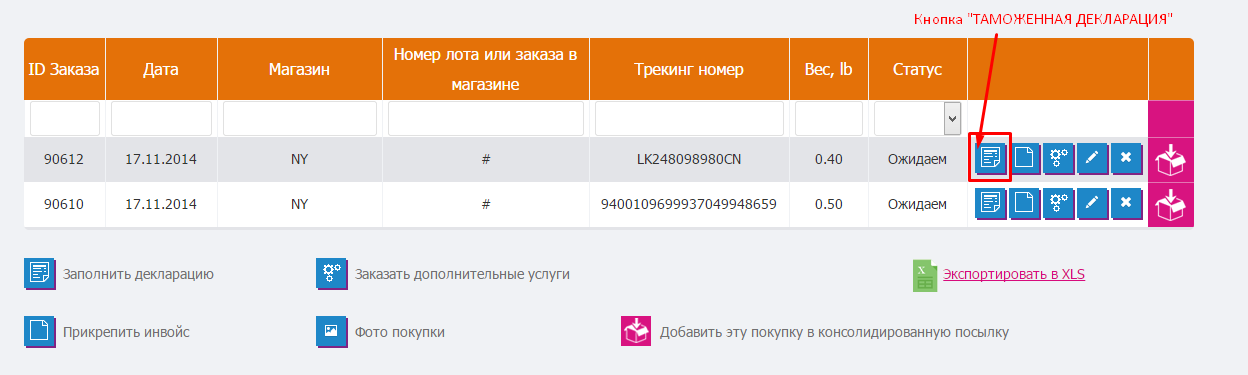 Кнопка вызова окна с таможенной декларацией расположена напротив каждого заказа.