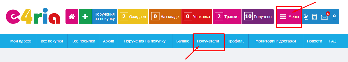 3. После заполнения таможенной декларации и предоставления инвойсов необходимо предоставить копию паспорта получателя. Копии указанных документов необходимо загрузить в Личный кабинет в карточку получателя – МЕНЮ → ПОЛУЧАТЕЛИ: