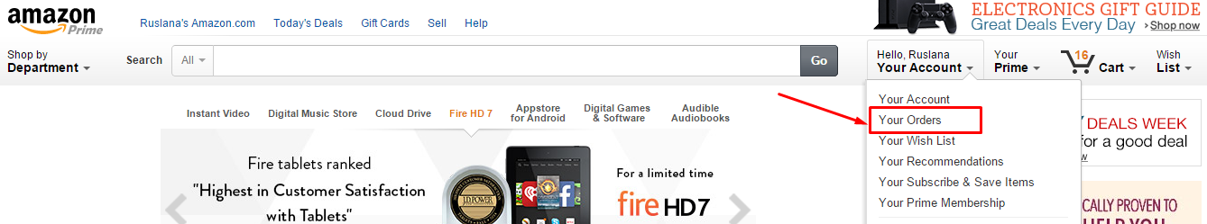 Например, в интернет-магазине Amazon инвойс можно сохранить из истории заказов: